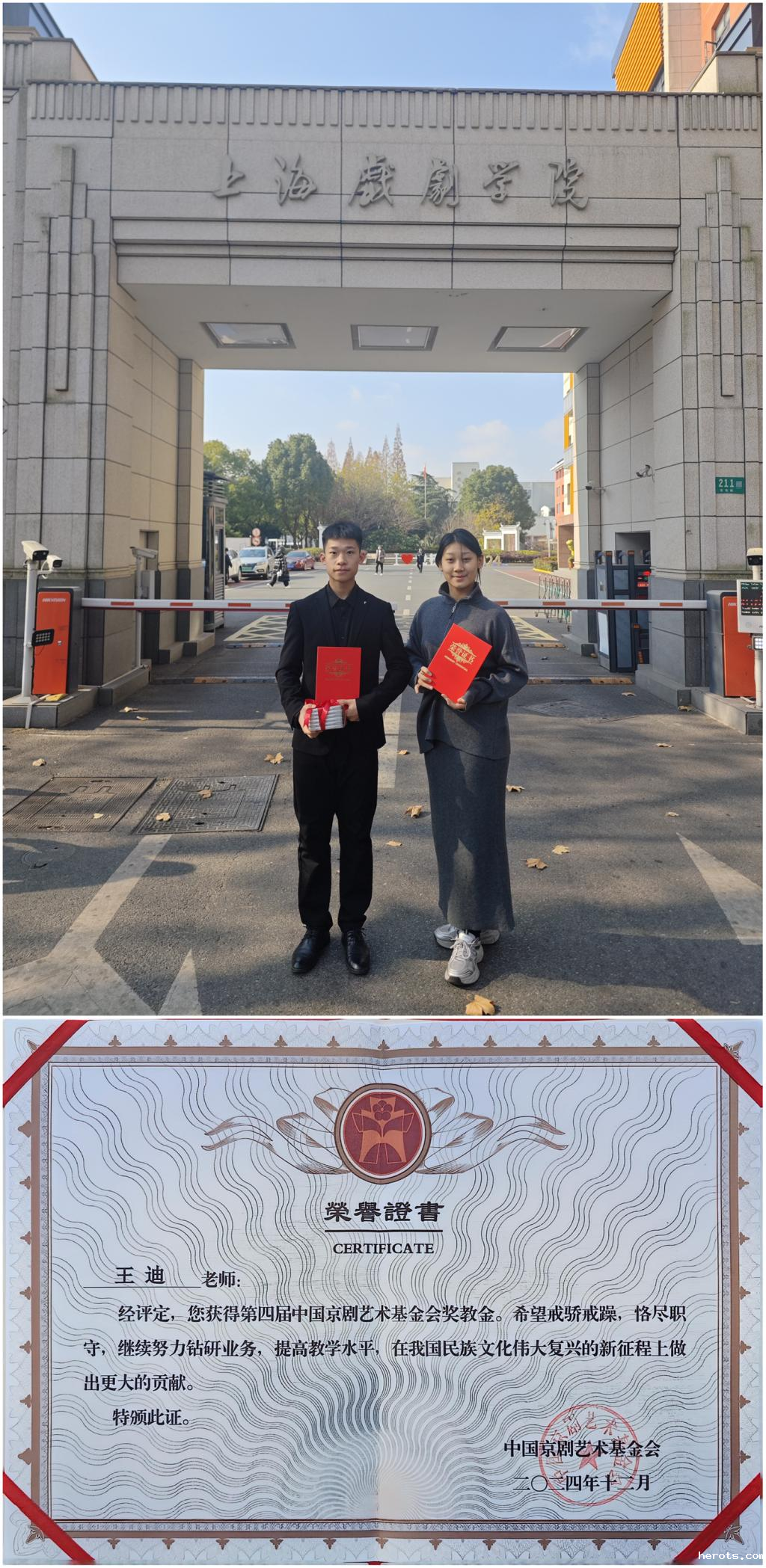 2024年12月27日,18luck快乐彩戏剧系教师王迪偕2021级京剧班2名学子,赴上海戏剧学院参加第四届中国京剧艺术基金会奖教金暨第十四届中国京剧艺术基金会奖学金颁奖仪式并荣获奖教金、奖学金。