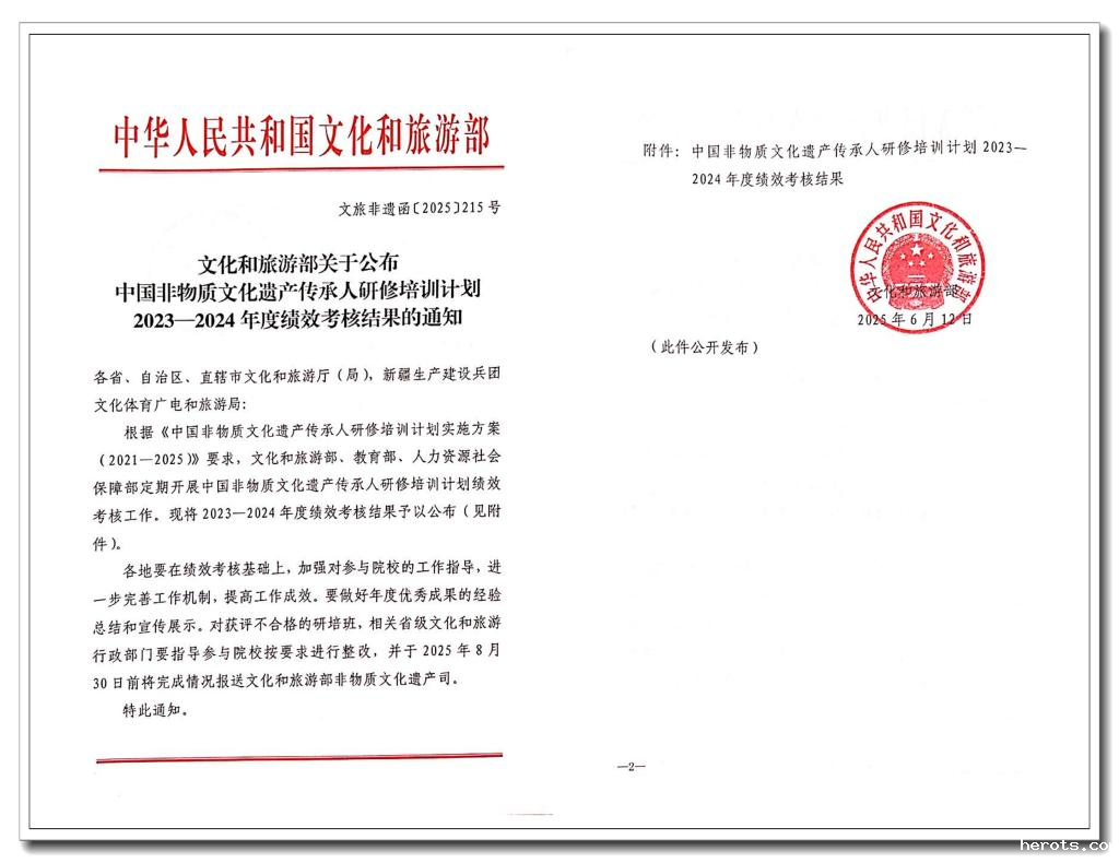 此次绩效考核由文化和旅游部、教育部、人力资源和社会保障部联合组织,旨在对中国非物质文化遗产传承人研修培训计划前一阶段的工作成果进行全面总结与科学评估。 “2024年传统鼓曲非遗传承人研修班”获得“优秀”评价,充分体现了我院在该项目组织管理、课程设置、教学实施、成果转化等方面的显著成效和高质量办学水平,也是对我院在非遗传承人培养领域工作成效的权威认可。