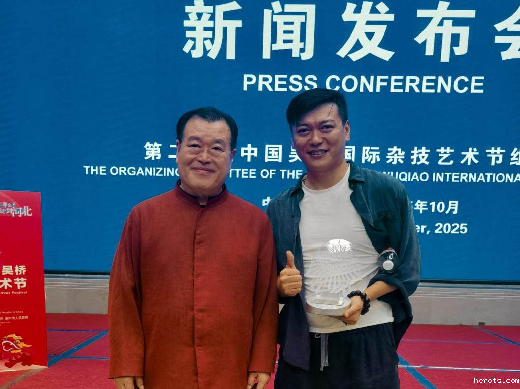 高东老师(右一)在颁奖仪式上与中国文联副主席、中国杂技家协会主席、河北省文联主席边发吉(左一)合影