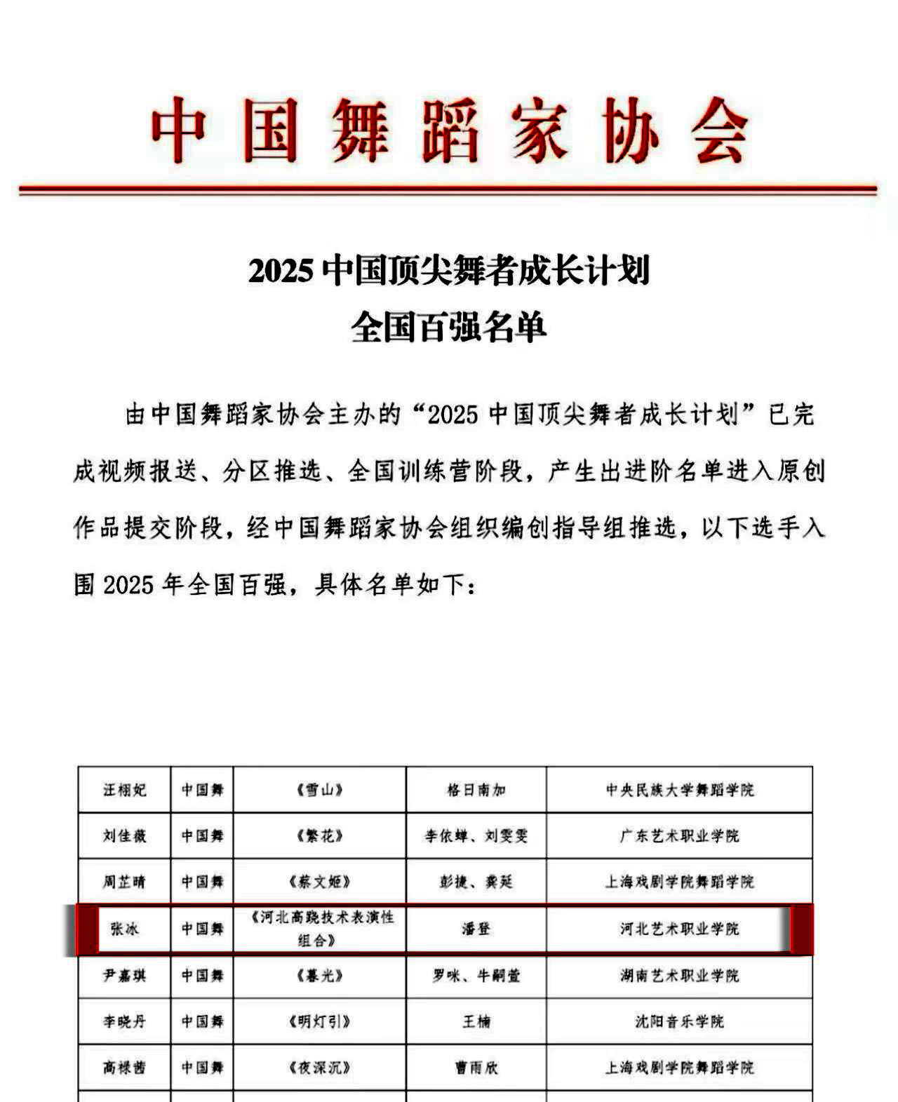 近日,2025中国顶尖舞者成长计划全国百强名单公布,18luck快乐彩舞蹈系学子张冰携作品《河北高跷技术表演性组合》成功突围,跻身全国百强,成为河北省唯一入选舞者。