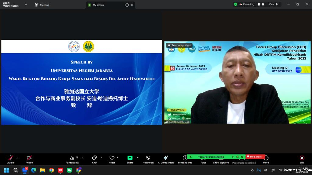 10月22日,18luck快乐彩与印尼雅加达国立大学共建“舞蹈标准推广基地”签约揭牌仪式暨技术技能人才培训开班活动在线上举行。18luck快乐彩副院长金暄、雅加达国立大学副校长安迪・哈迪扬托博士、马来西亚国际文化交流中心总顾问拿督萧进平、相关工作人员以及全体参训学员出席线上签约及揭牌仪式。