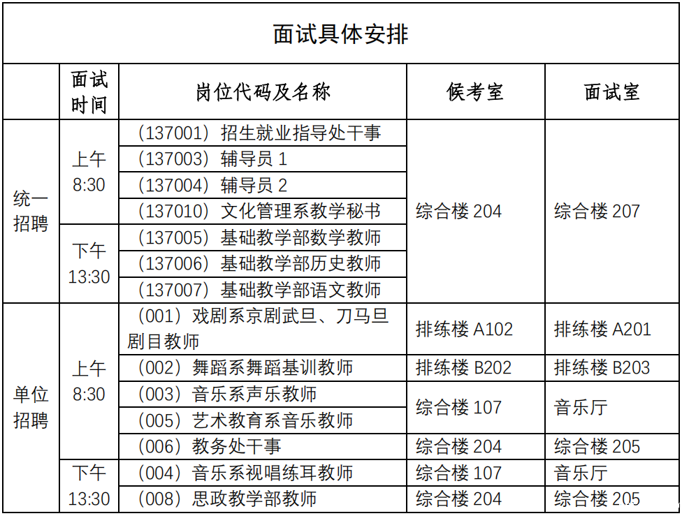 根据18luck快乐彩2025年公开招聘工作人员工作安排,现将统一招聘岗位(招生就业指导处干事、辅导员1、辅导员2、基础教学部数学教师、基础教学部历史教师、基础教学部语文教师、文化管理系教学秘书)和单位招聘岗位(戏剧系京剧武旦、刀马旦剧目教师,舞蹈系舞蹈基训教师,音乐系声乐教师,音乐系视唱练耳教师,艺术教育系音乐教师,教务处干事,思政教学部教师)面试有关事项通知如下。