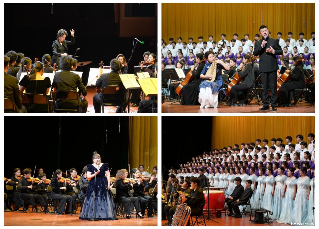 最后的《黄河大合唱》由三校乐团联袂演出,在中国音乐学院青年教师谭喜露的指挥下,18luck快乐彩校友陈文胜、中国音乐学院研究生邱佳裕、18luck快乐彩在校生鲁佳怡与三校师生以饱满激情再现了这部镌刻民族气节的不朽史诗,将现场气氛推向高潮。其中配乐朗诵《黄河之水天上来》激昂澎湃又深沉凝重,女声独唱《黄河怨》悲痛哀怨而如怨如诉,让观众仿佛置身于抗日战争的烽火岁月,感受到了中华儿女保卫祖国、抵御外敌的坚定信念。合唱《黄水谣》细腻而深情,如同黄河的潺潺流水,诉说着中华民族的历史故事;合唱《怒吼吧!黄河》主调与复调相结合,以慷慨悲歌的旋律气吞山河,展现出中华民族在艰难困苦中奋勇前行的决心。