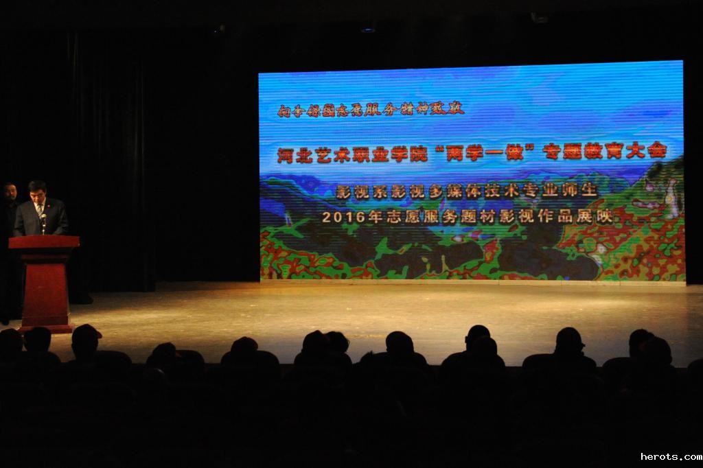 2016年11月2日,由学院党委策划,影视系党支部承办的“两学一做”主题教育大会暨影视系志愿服务题材师生影视作品展映活动在四楼剧场举行。学院党委书记赵宗更、副书记延凤宇、副院长刘飞、纪委书记张学红、副院长刘志欣以及学院师生党员、入党积极分子、影视系师生、学生青年志愿者协会代表以及影视系部分学生家长代表共约300人参加了活动。