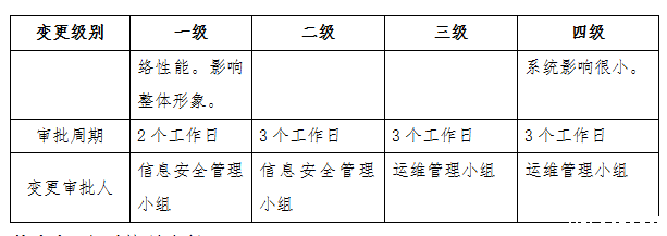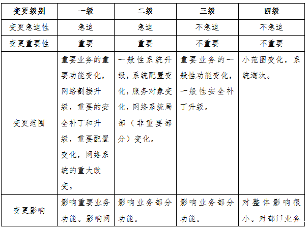3、针对周期性的同一变更工作(三级和四级),须形成统一、标准的变更方案。在变更过程中可简化对此类变更工作的审批工作。