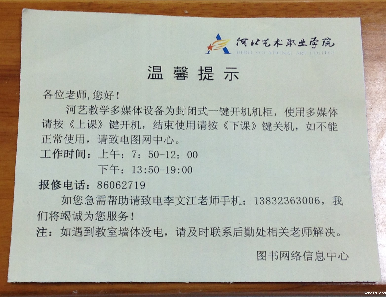 我院网络多媒体教学设备和办公网络改造现已完成,正式投入使用,如日常教学和办公遇到困难,请打图书网络信息中心维修组电话:86062719(综合楼705室),或李文江老师手机13832363006。