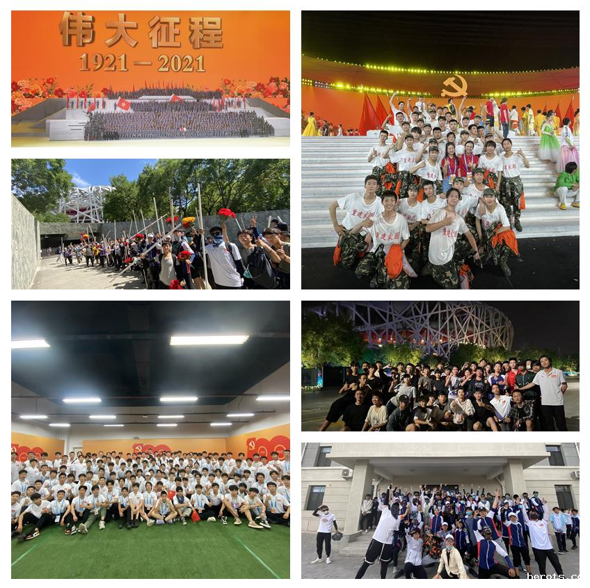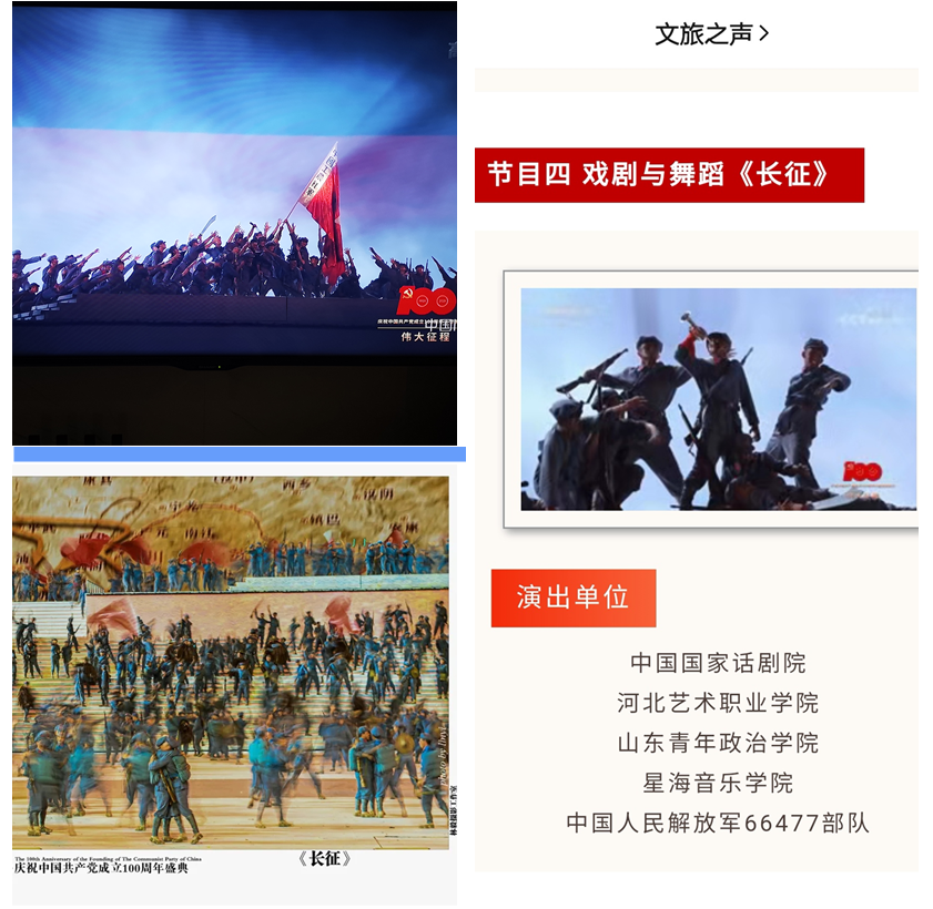 2021年4月9日,18luck快乐彩150名学子平安、顺利抵达排练基地,历时三个月的封闭排练,最终于2021年6月28日晚,顺利完成参与四个篇章六个节目录制任务的重要演出工作,在《伟大征程》的四个篇章中,18luck新利官网登陆学生分别在序章“盛典仪式”、第一篇章“浴火前行”的戏剧与舞蹈《长征》、第二篇章“风雨无阻”的戏曲与舞蹈《激情岁月》、第三篇章“激流勇进”中的情景舞蹈《党旗在我心中》、合唱与舞蹈《行进的火炬》,以及尾声“领航”中,以激情澎湃的舞姿,再现共产党人崇高革命理想和坚定共产主义信念,热情讴歌中国共产党百年丰功伟绩。