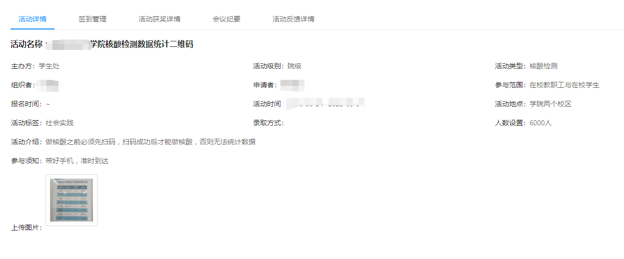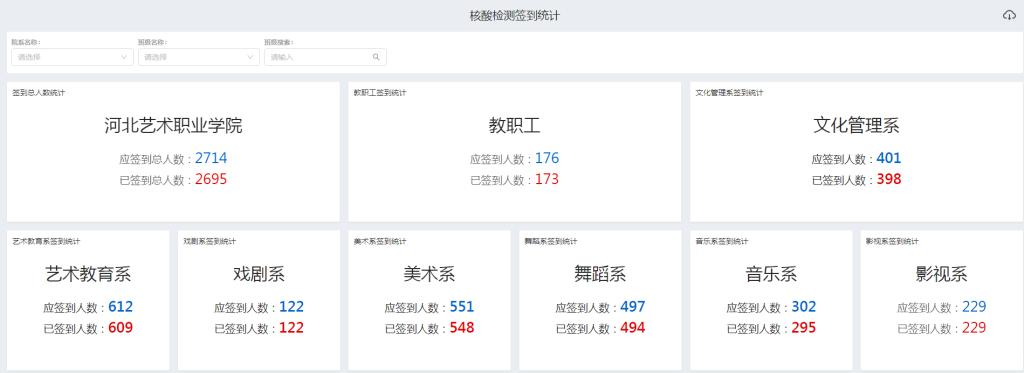 依托学院智慧校园数据中台和BI大数据分析系统,为全院师生提供了核酸检测签到服务,方便人事处、学生处查询师生核酸检测记录,确保每次核酸检测做到无人漏检。