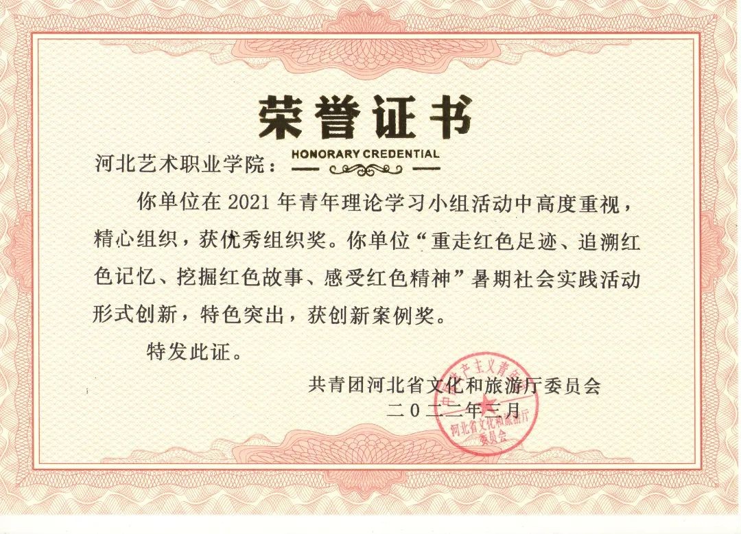 近日,在河北省文化和旅游厅直属机关委员会公布的《关于表扬表彰青年理论学习小组先进单位和个人的通报》中,18luck快乐彩团委组织开展的“重走红色足迹、追溯红色记忆、挖掘红色故事、感受红色精神”党史学习教育主题暑期社会实践活动荣获创新案例奖,杨丹丹、吕晓雷两位教师获“青年读书标兵”荣誉称号。