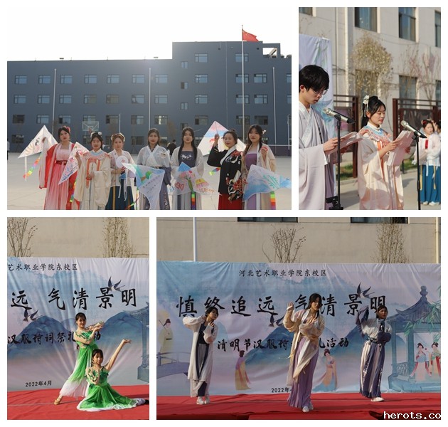 伴随着悠扬典雅的古曲,一段唯美的舞蹈《玛吉阿米》拉开活动的序幕。随后,铿锵有力的配乐诗朗诵《中国人的清明节》表达了同学们对古代先贤、仁人志士、革命英雄的深切缅怀;古典歌曲《棠梨煎雪》、舞蹈《春三月》、《谪仙》轮番登场,描绘出一幅春意盎然、春回大地的春色美景;诗词诵读《琵琶行》让在场的各位同学感受到了古典诗词的魅力;汉服、旗袍舞台秀展现了中华民族传统服饰之美,给人带来美的享受。活动最后,老师和同学们共同放飞风筝,寄托心中对美好生活的祝福祝愿。