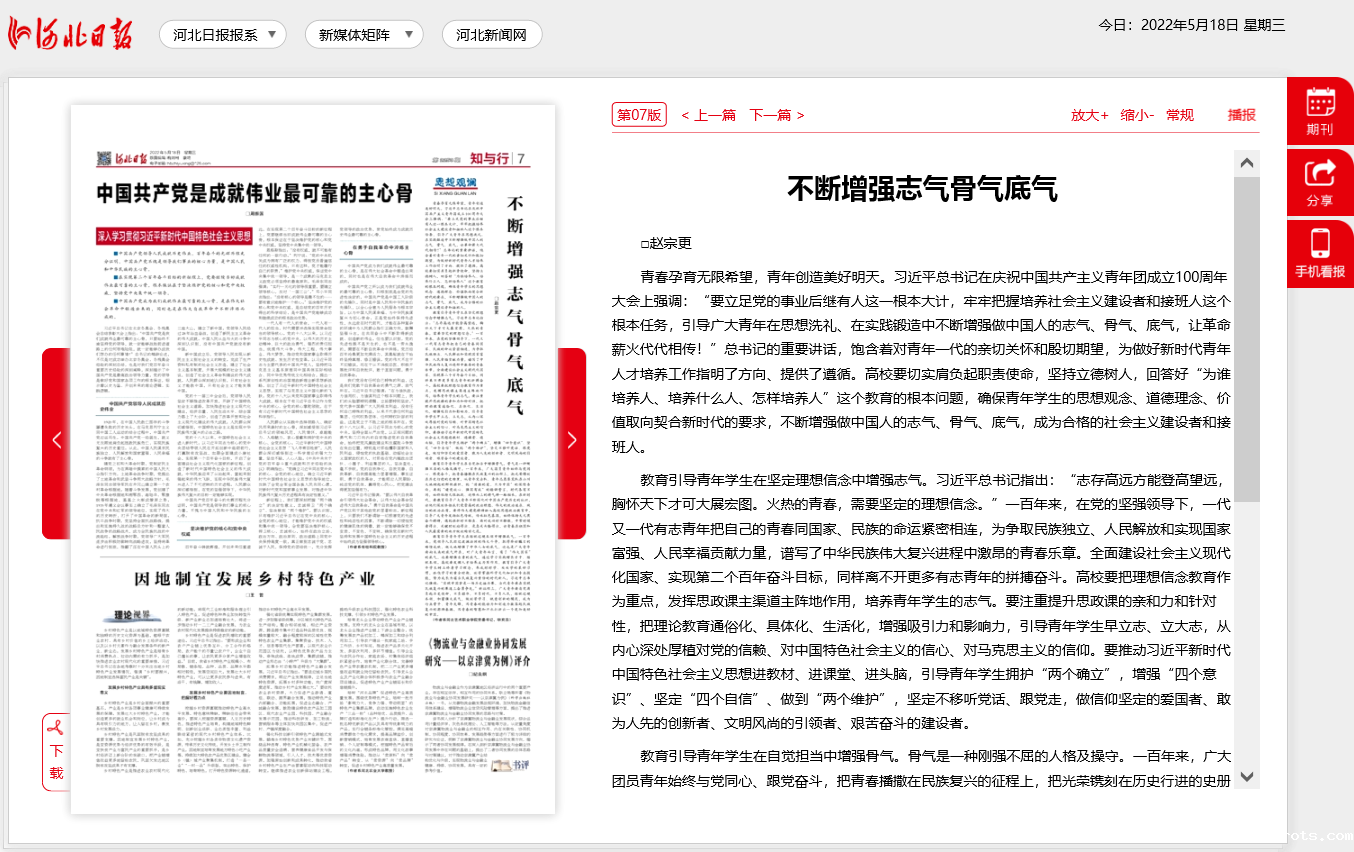 2022年5月18日,18luck快乐彩党委书记赵宗更理论文章《不断增强志气骨气底气》在《河北日报》第7版刊登发表。