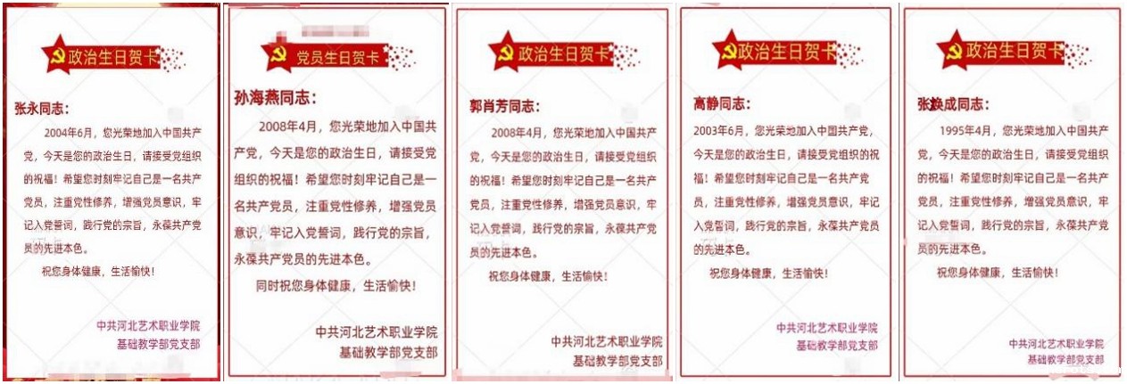 为激发党员干部守初心、担使命的政治责任感,增强党员党性意识和实干精神,基础部党支部为上半年加入中国共产党的五位党员老师集体庆祝“政治生日”,并给他们定制了精美的生日贺卡,小小贺卡写满了对每一位党员的深情激励、叮咛和祝福。对普通人而言,生日只有一个,就是出生的那天;对于中国共产党党员来说,却有着两个生日,除出生日外,另一个特殊的生日就是加入共产党那一天的“政治生日”。当党员在鲜红的党旗下郑重宣誓“我志愿加入中国共产党”时,便意味着作出了坚定信仰共产主义的政治抉择,作出了将自己的一切交给党的庄严承诺——这样一个人生的重要时刻,理应被深深铭记。