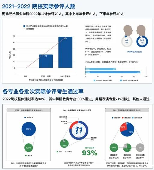 2022年,我院舞蹈系组织了2场在线学习服务职业技能(中级)证书考试,共有70名大专学生参加,整体通过率达93%。其中舞蹈教育专业的考试通过率为100%,一名同学由于考试成绩突出,受到评价组织高度认可,获得了提前就业的机会。2022年度考试工作的圆满完成实现了18luck新利官网登陆舞蹈在“1+X” 在线学习服务职业技能等级证书工作成绩上零的突破,是舞蹈系整个“1+X”课程体系建构的阶段性成果。
