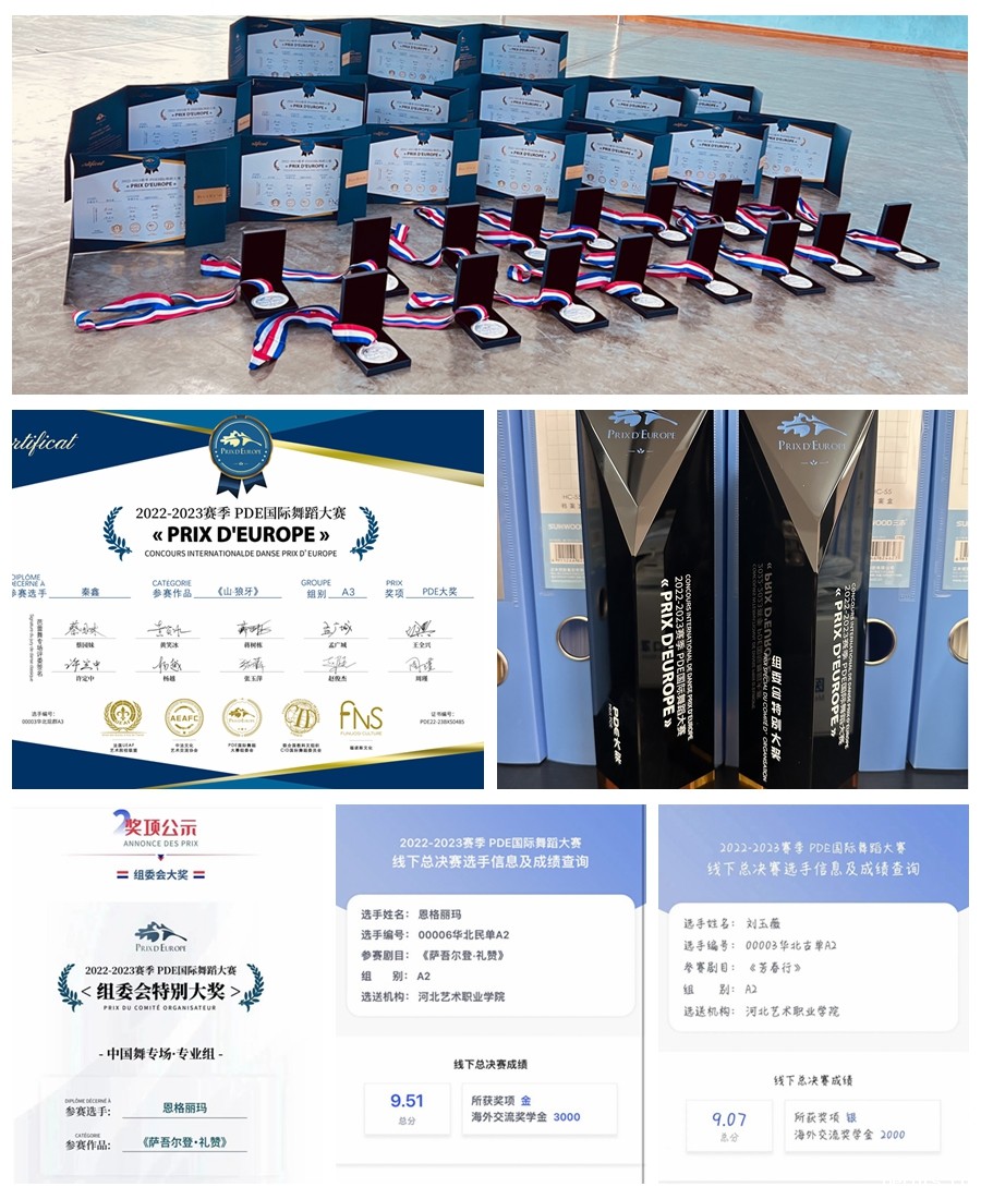 2023年4月8日,2022-2023赛季PDE国际舞蹈大赛线下总决赛在陕西大剧院举行,18luck快乐彩舞蹈系中职2020级新疆班学生恩格丽玛表演的蒙古族舞蹈《萨吾尔登•礼赞》、中职2018级中国舞班学生刘玉薇表演的中国古典舞《芳春行》,分别荣获民族民间舞(少年专业组)金奖,古典舞(少年专业组)银奖。另外在本赛季PDE线上总决赛中,学院群舞《山·狼牙》《望昨日时》分获现代舞组大奖及银奖。学院副院长金暄率队参赛。