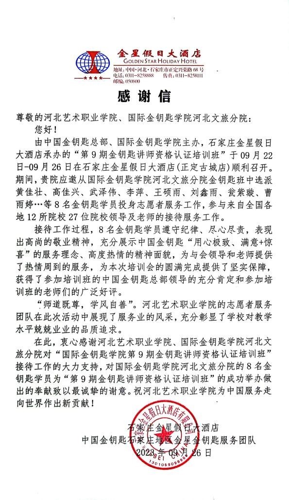 9月23至25日,由中国金钥匙总部、国际金钥匙学院主办,石家庄金星假日酒店承办的“第九期金钥匙讲师资格认证培训班”在石家庄市金星假日酒店隆重举办。国际金钥匙学院河北文旅分院金钥匙学员、18luck快乐彩文化管理系21级空中乘务专业8名同学为此次培训提供了高品质的服务工作并获得会务组的一致好评。
