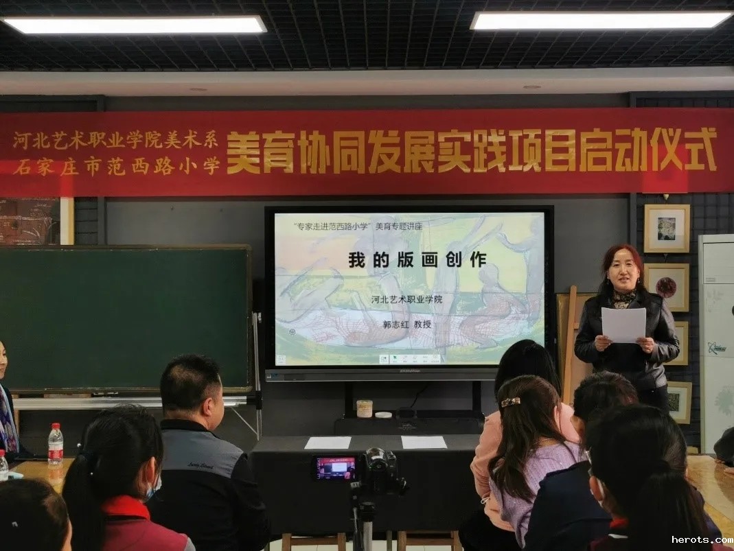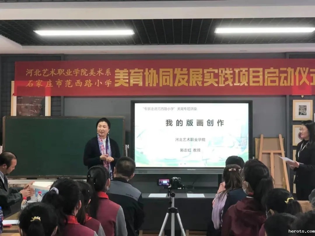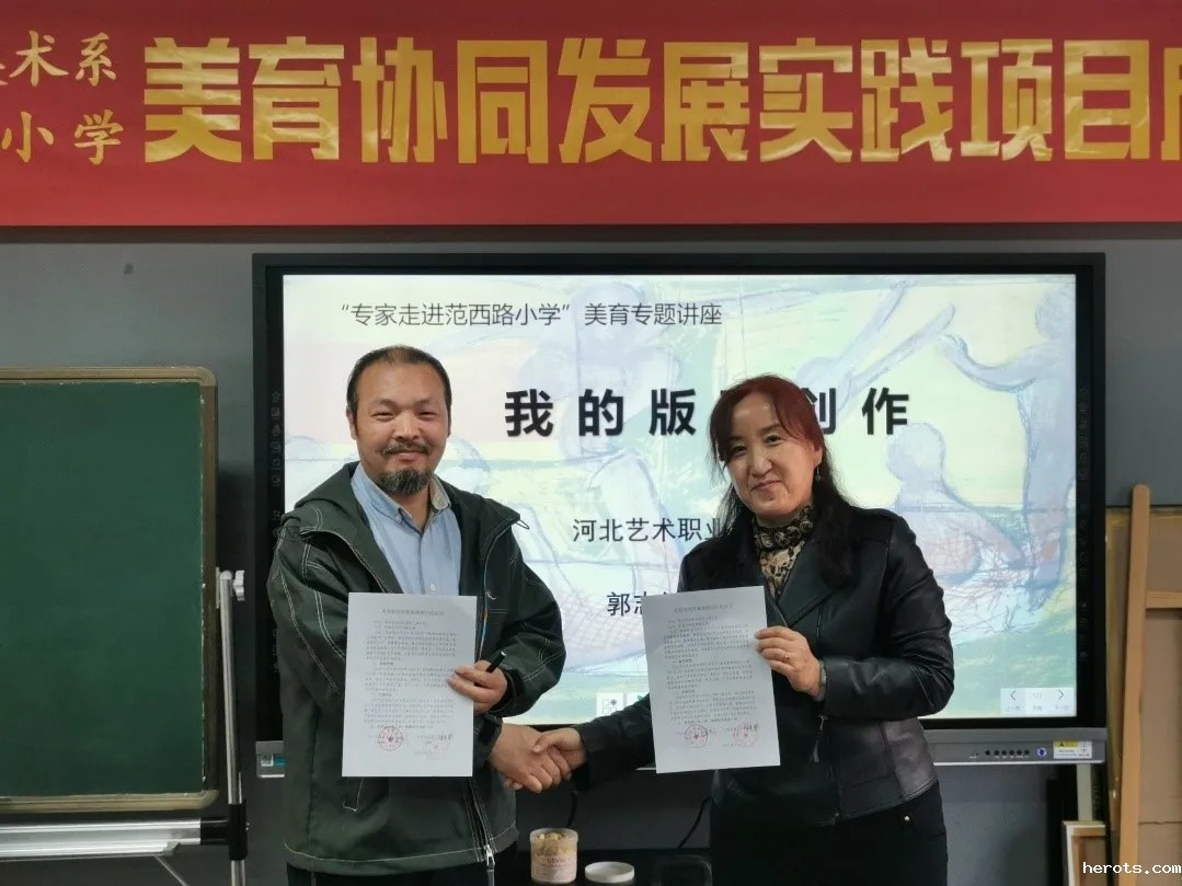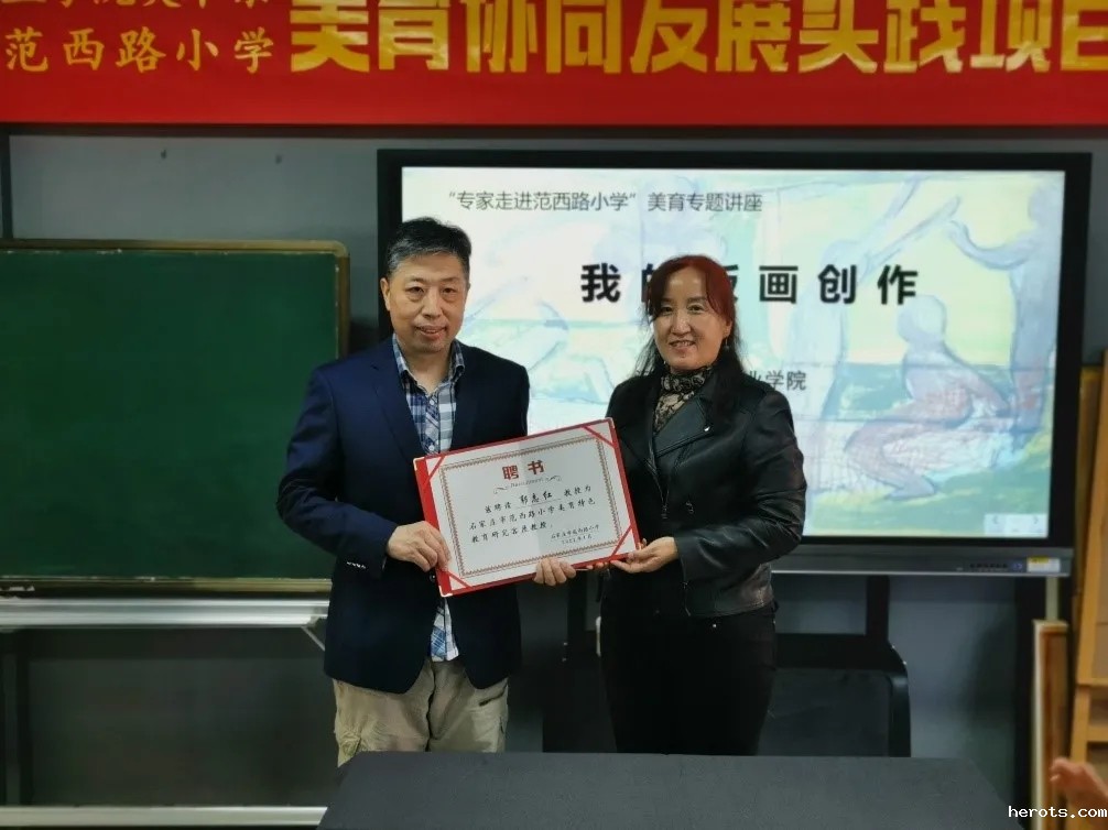 美术系主任关金国代表双方学校签署了共建协议,美术系教授郭志红被聘为范西路小学客座教授。